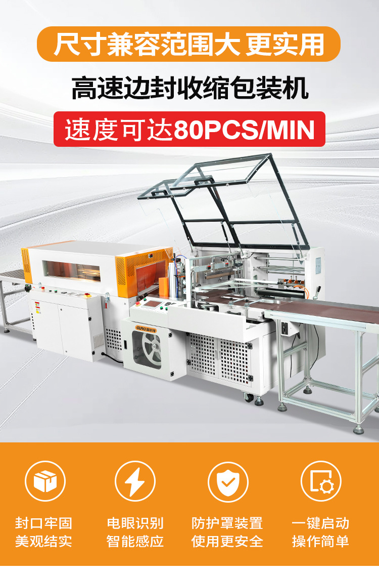 全自动高速边封收缩包装机是用于对产品进行全自动在线高速收缩包装,采用光电对产品进行自动侦测,包装能力为每分钟85包,适合包装 各类型不同大小及形状的产品。触屏控制机器,调节方便简单,同时可储存多种产品包装数据,使用时可直接从系统中调出,方便快捷,大大缩短更换包装产品时所需的时间。该款收缩包装机广泛用于批量生产包装的流水作业,印刷、彩盒、贺卡、相册、相框、医药、电子、日 化、化妆品、汽配、五金、食品等大批量生产的行业。