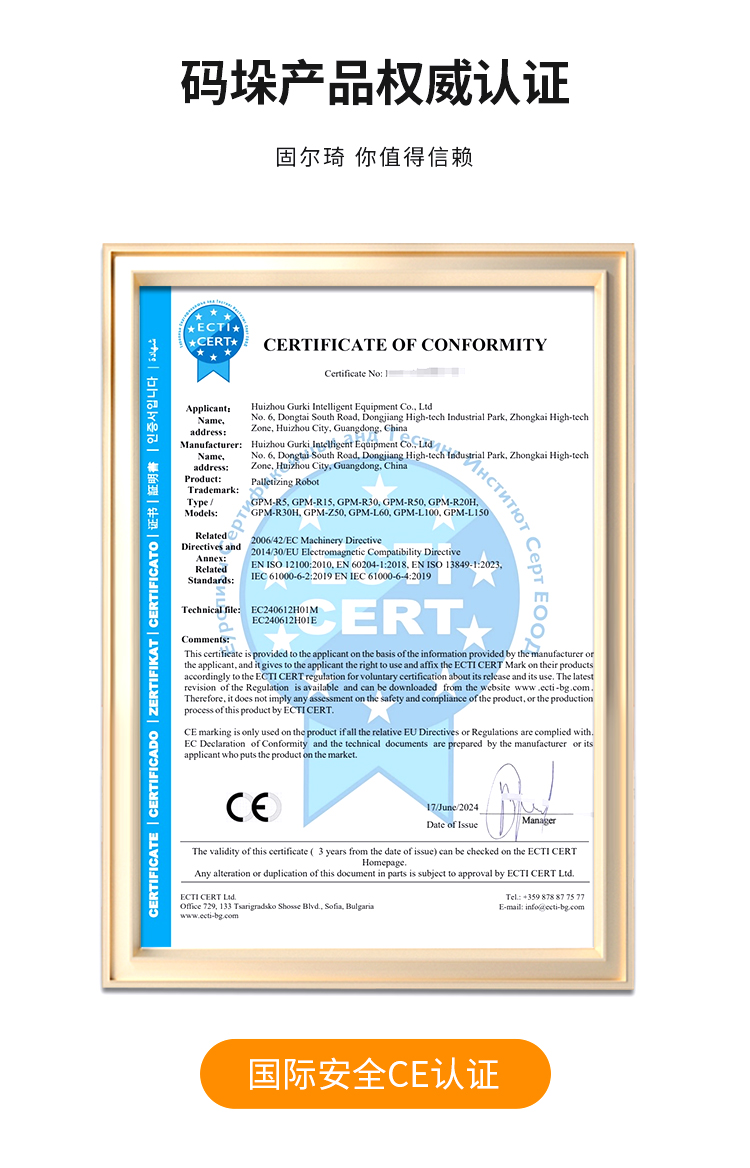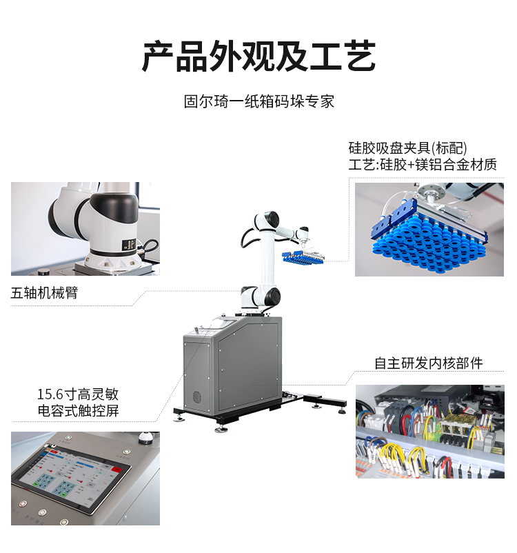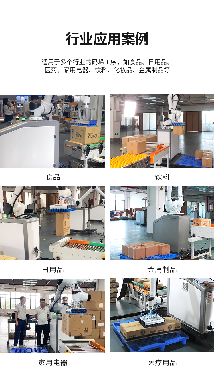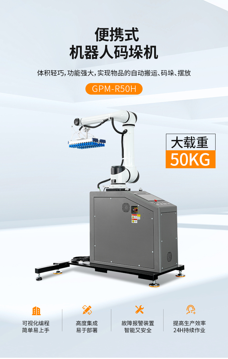 50KG协作机器人码垛,与人类工作人员紧密合作,提高生产效率、灵活适应不同任务。安全配备传感器,为工作人员创造更安全高效的工作环境,外形精巧美观,调整方便简单,本设备采用触控屏操作,实现智能化操作管理,简便、易掌握。可大大地减少劳动人员和降低劳动强度。可独立使用也可配套自动供栈机和栈板输送机来实现全自动码垛系统,广泛应用于多个行业的码垛工序,如纸箱类、医药类、日用品、食品、饮料、化妆品、金属制品等。