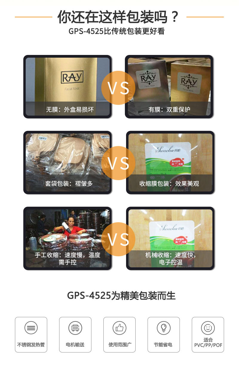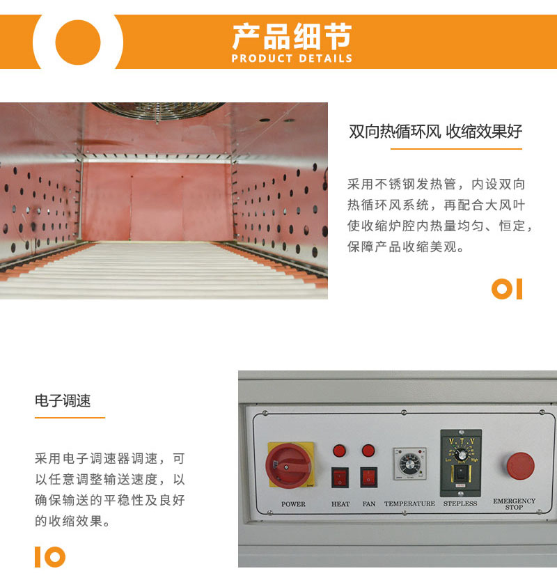 恒温收缩包装机主要是用收缩薄膜对产品进行外包装,提高品牌形象程度,增加美观及价值感。该款恒温收机采用内循环风道设计,保证炉内温度均匀;不锈钢发热管,发热稳定,使用寿命长;输送滚轴的外部包耐高温硅胶管,耐磨耐高温,使用寿命长。耐高温隔热帘布,大大减少热能损耗,可自动降温关机,无需人工等待关机。该款收缩包装机适用于饮料、啤酒、矿泉水、易拉罐、玻璃瓶有纸托、纸箱等集合或单一收缩包装。
