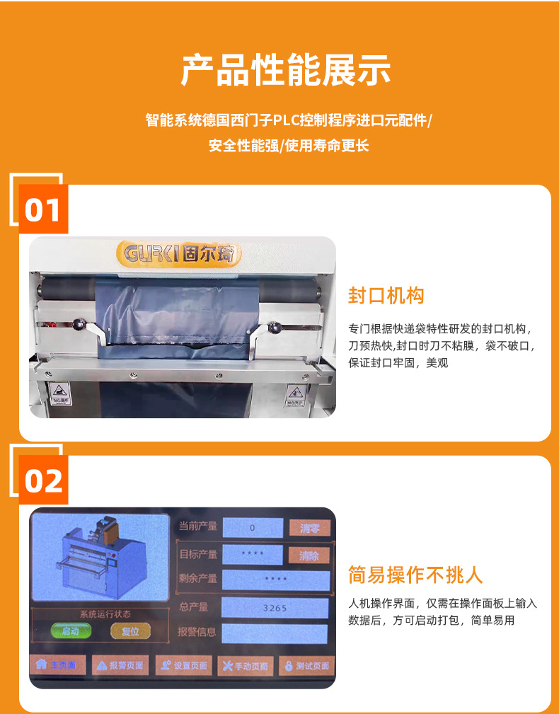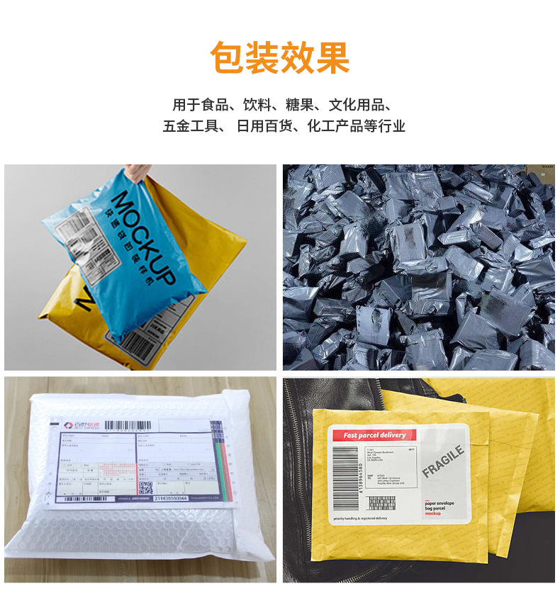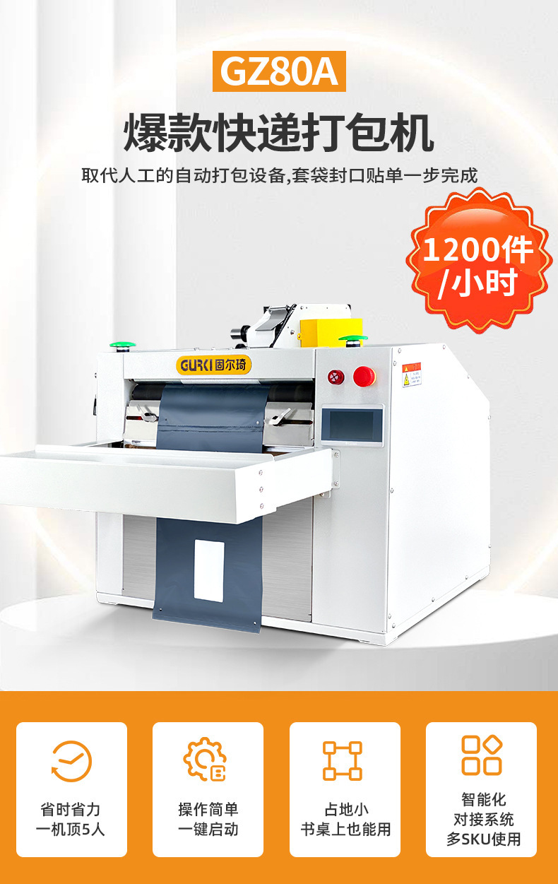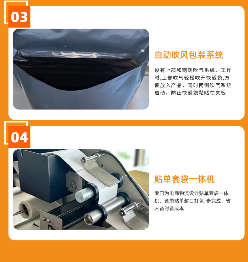 本产品为电商客户量身订做,提供自动扫描、自动套快递袋、对快递袋实现自动封口、自动粘贴面单以及货品自动输送等一体化解决方案。同时,该设备采用精加工生产工艺,采用台面式设计,更符合人体工程美学,减少占地面积,满足中小电商物流企业每日500-3000单发货需求。触摸屏操作面板,调节简单,换人交接更方便,该机适用多种连卷膜,速度可达1500袋每小时,亦可根据客户需要,自动对接电商订单和企业ERP 或 WMS 系统,为客户提供货品的塑料袋包装发货整体解决方案。