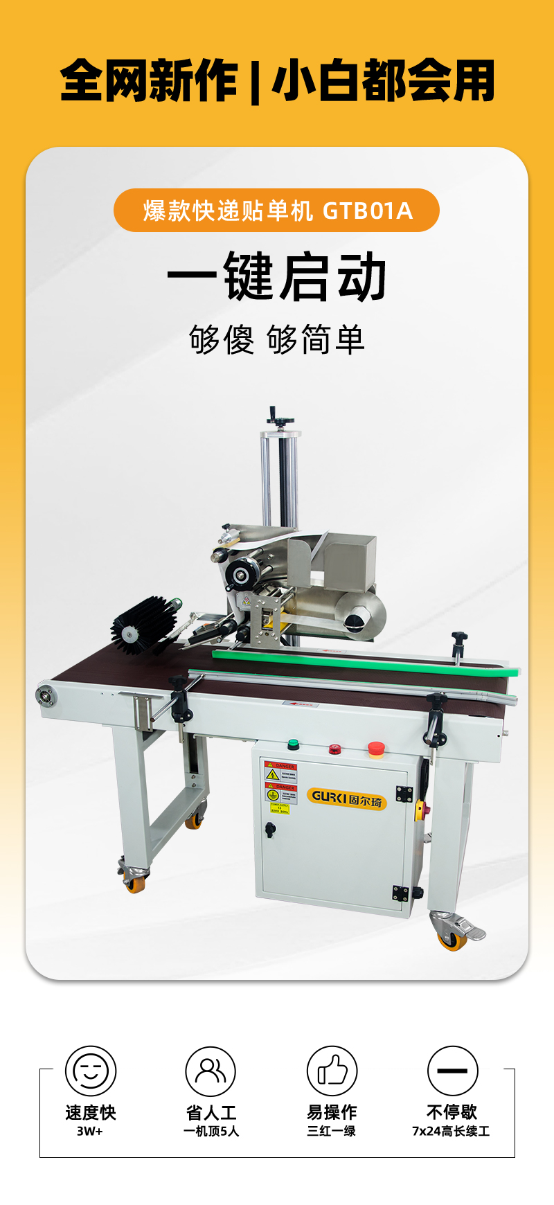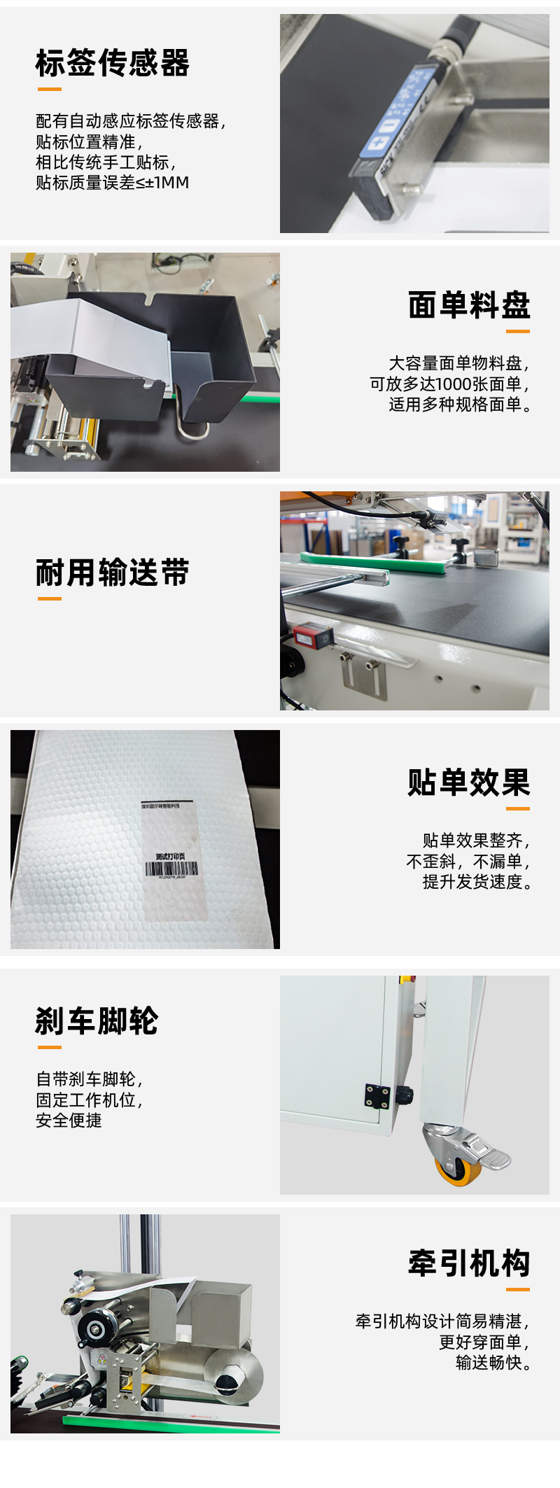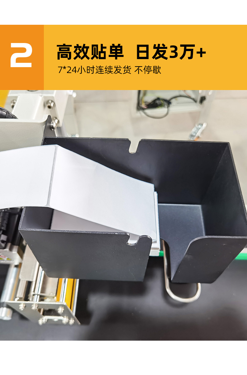 自动快递贴单机是我司自主设计生产的一款24小时无人化连续贴单作业的设备,该机具有一键启动,傻瓜式操作的特点,日贴3万+,操作使用体验更好。同时,该机针对信封等较薄的证件贴面单,设有光纤传感器,方便更加快速贴单,适用于贴各种规格的大小纸箱、快递面袋等,可实现打印快递面单后,产品一边输送一边贴单,贴单平实、贴单位置精准,不倾斜,精度误差≤±1mm。可单机使用也可配套封箱机使用,广泛应用于仓储、物流、电商等行业。
