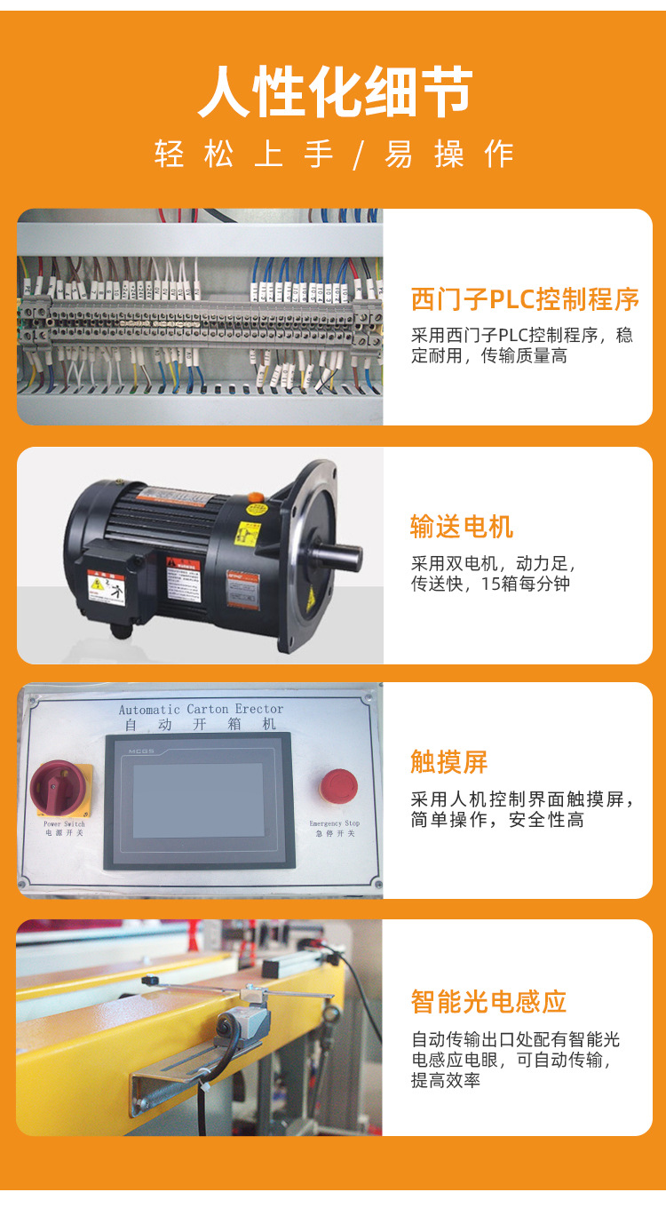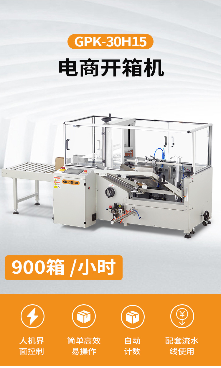 电商开箱机专门为电商行业打造的纸箱快速成型的机器,每分钟满足15箱的需求,能够解决电商旺季打包数量多,包装慢的问题,同时它不需要任何维护,只要通电就可以立即使用,可以配套称重、贴标、扫码等设备使用,同时可以接入仓储系统,完成整一个仓储出货盘点。