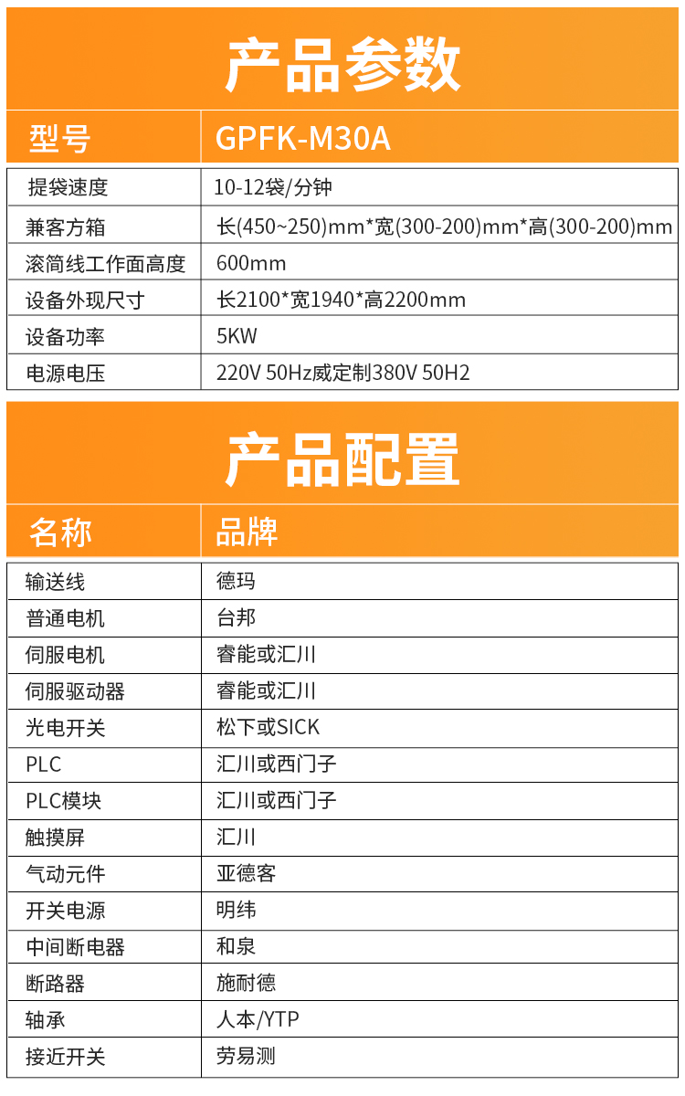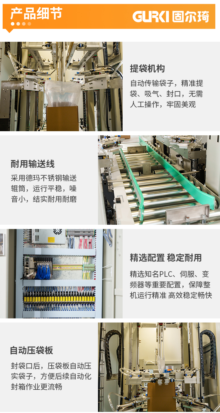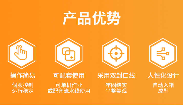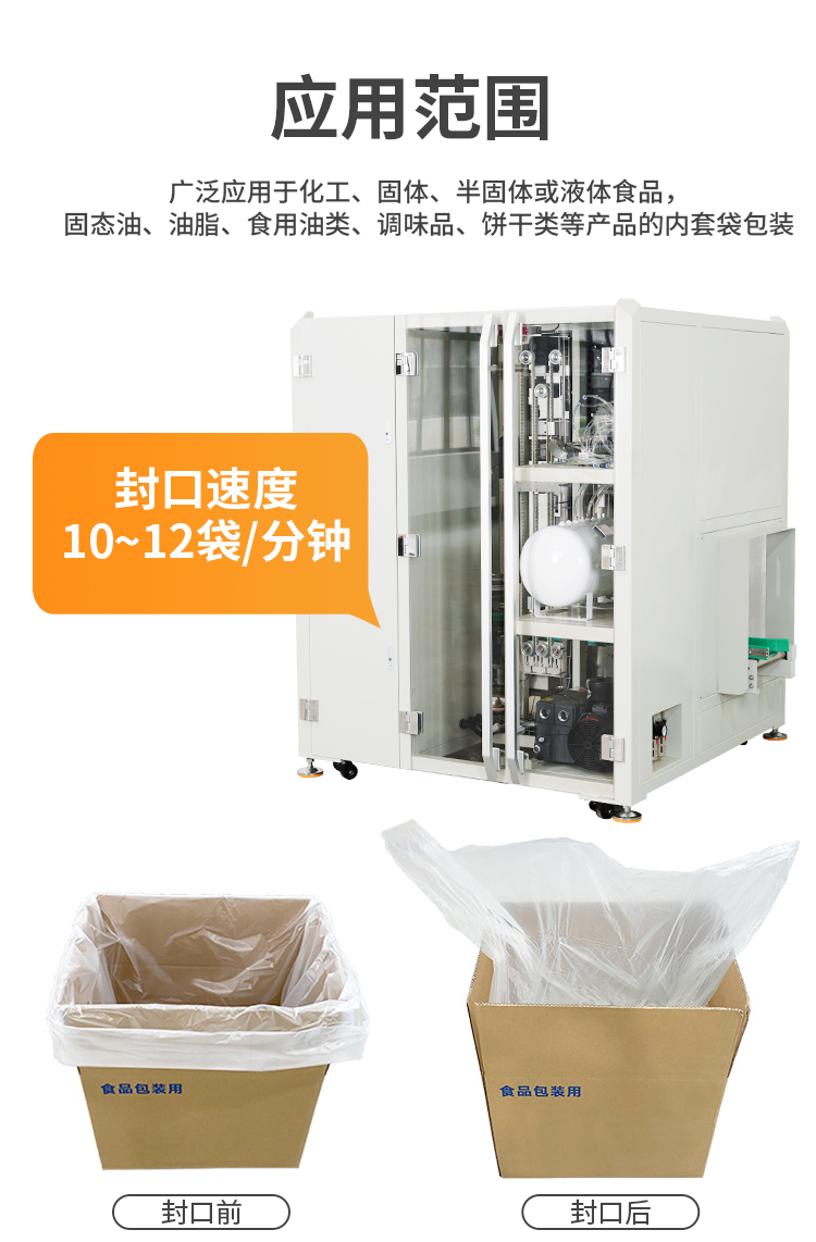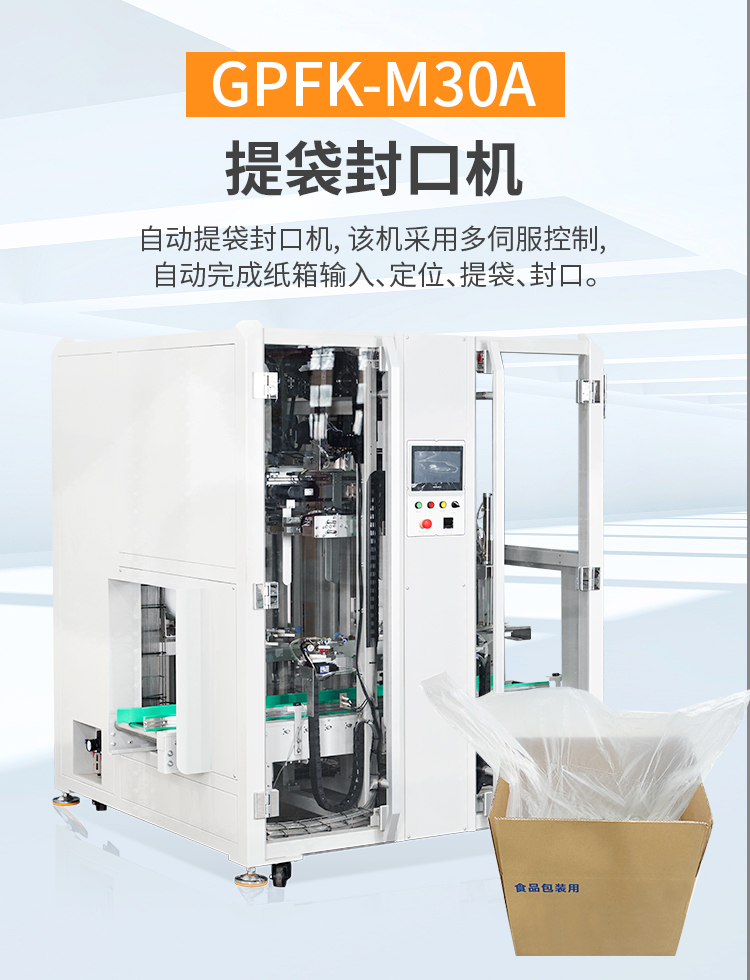 自动提袋封口机, 该机采用多伺服控制, 自动完成纸箱输入、定位、提袋、封口。自动提袋封口一次同步成型, 无需停机, 可衔接前段自动纸箱内套袋机, 后段自动封箱机、自动纸箱内套袋和自动封箱机实现无人化自动包装。该款提袋封口机适用PE膜材质,运用于化工、粉末、固体、半固体或液体、食品,固态油、油脂、食用油类、调味品、饼干、生鲜水果类等产品提袋封口作业。