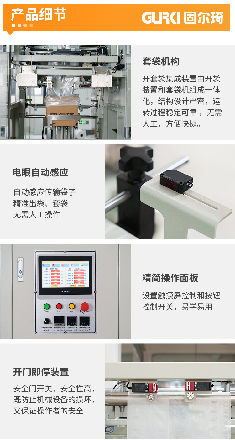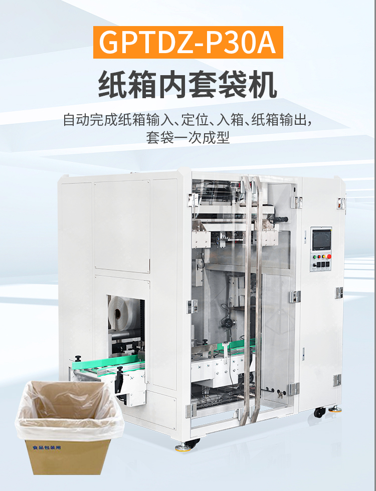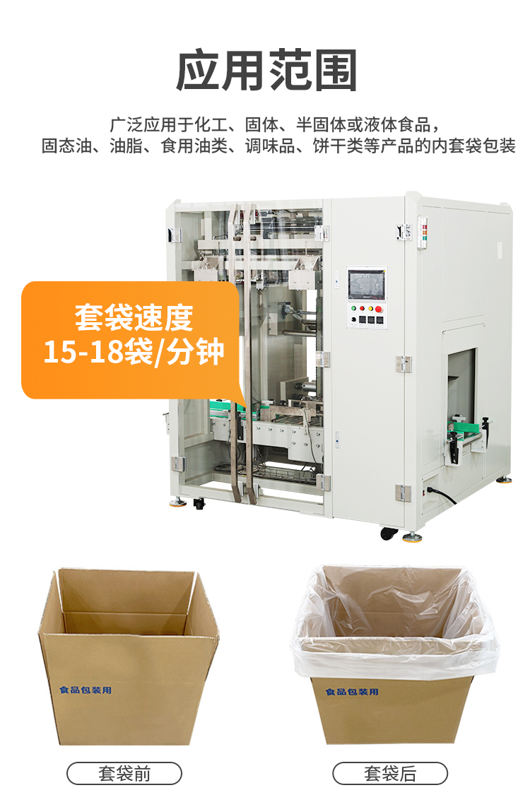 自动纸箱内套袋机,该机采用多伺服控制,自动完成纸箱输入、定位、卷膜输出、入箱、切膜、折边、纸箱输出。自动套袋一次同步成型,无需停机,可衔接前段自动开箱机,后段自动装箱机、自动提袋封口机和自动封箱机实现无人化自动包装。该款套袋机适用PE膜材质,运用于化工、粉末、固体、半固体或液体;食品,固态油、油脂、食用油类、调味品、饼干、生鲜水果类等产品的内套袋包装。
