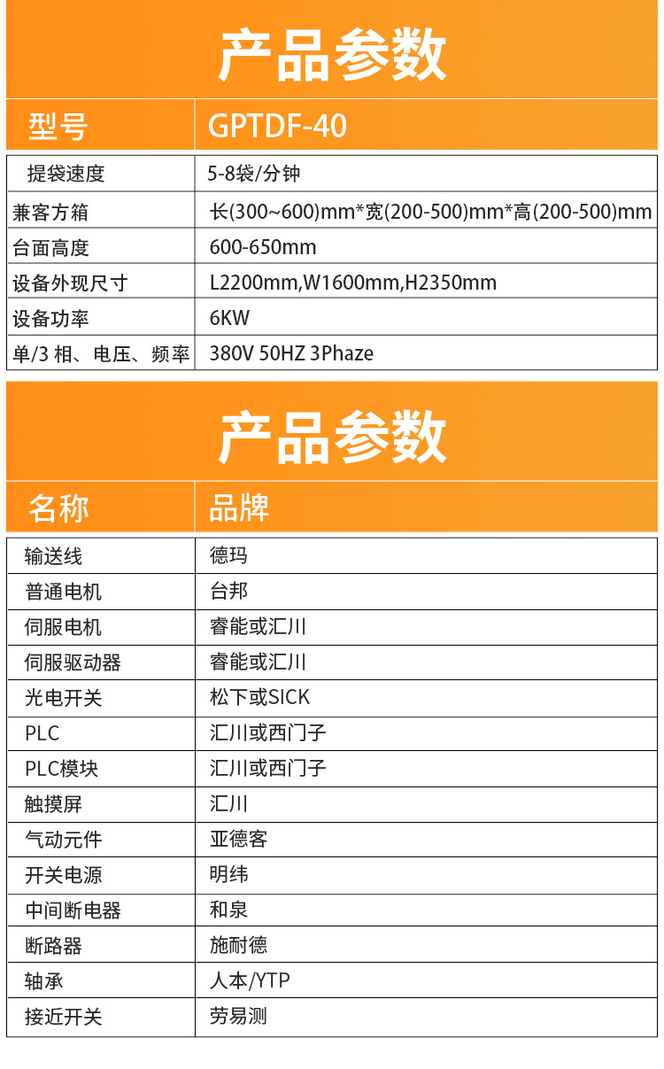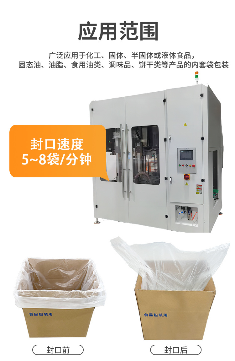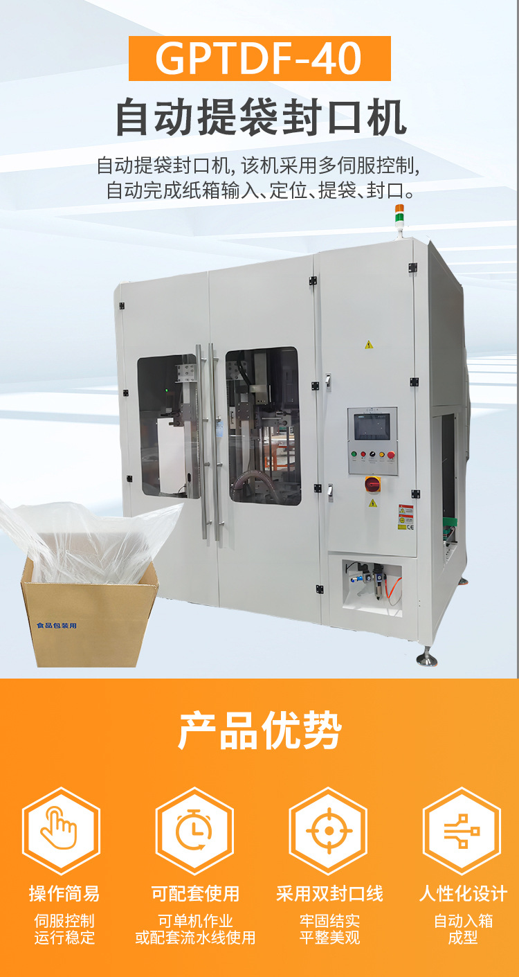 自动提袋封口机, 该机采用多伺服控制, 自动完成纸箱输入、定位、提袋、封口。自动提袋封口一次同步成型, 无需停机, 可衔接前段自动纸箱内套袋机, 后段自动封箱机、自动纸箱内套袋和自动封箱机实现无人化自动包装。该款提袋封口机适用P0、PE膜材质,运用于化工、粉末、固体、半固体或液体、食品,固态油、油脂、食用油类、调味品、饼干、生鲜水果类等产品提袋封口作业。